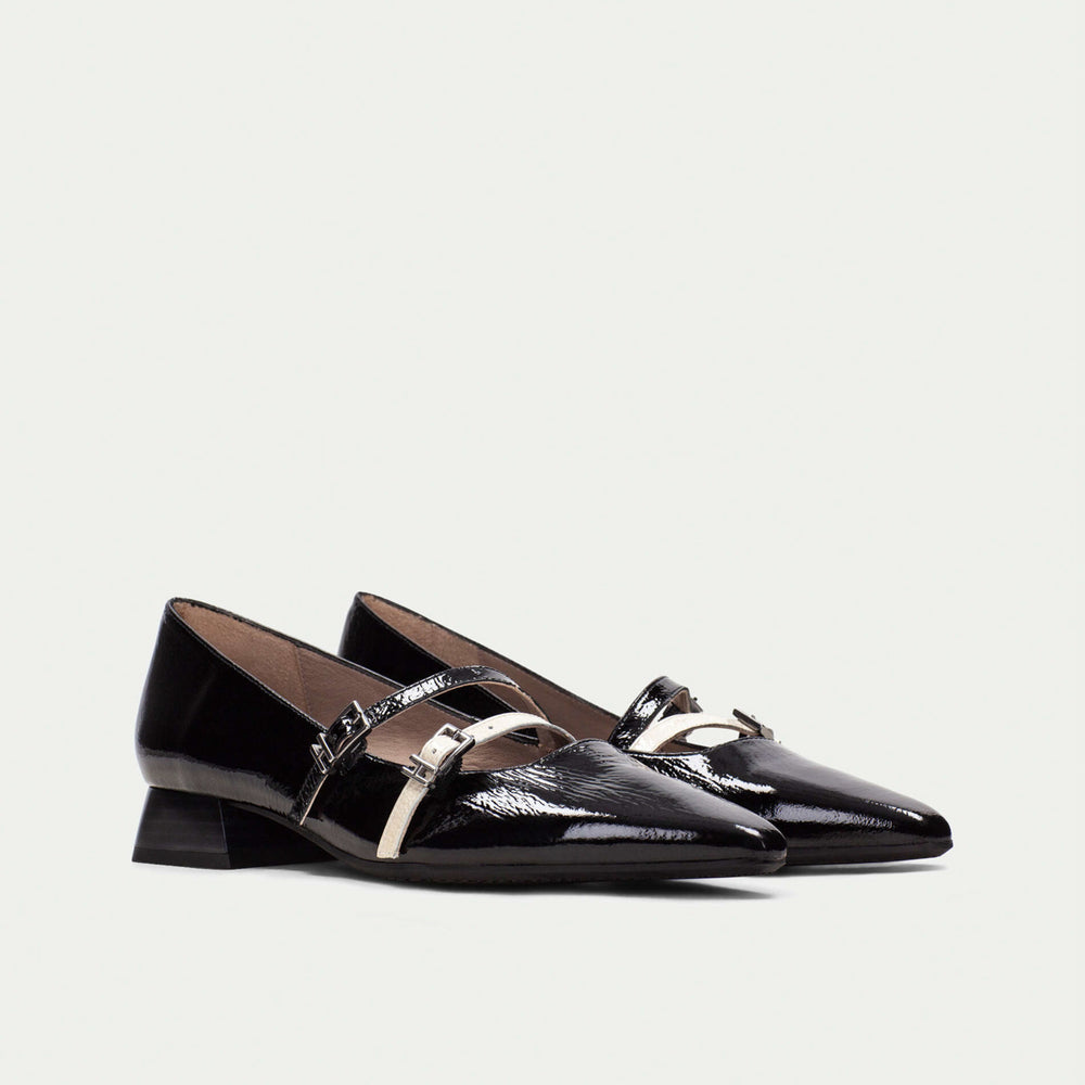 The Mary-Jane is a popular fashion choice this Winter, and the Hispanitas Dali style covers all bases. Available in black patent leather with black and cream straps over the instep, and rioja and forest. This beautiful shoe features a pointed toe, small block heel, adjustable straps and triple-layered cushioning throughout the footbed for comfort all day long. Perfect to wear with dresses or pants. European sizing. Made in Spain. Leather upper, leather lining, synthetic sole. Low heel. 2.5cm.