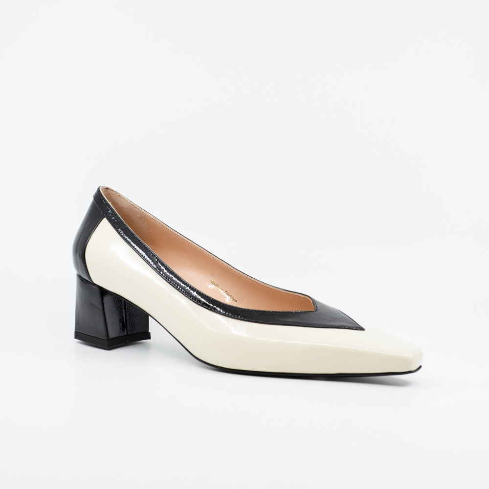 A striking patent leather heel for any special occasion this winter. A classic design and style you'll wear now and for many seasons to come. Featuring a mid block heel, pointed toe, padded footbed and contrasting black and white patent leather upper with a V cut throat. European sizing. Made in Spain. Leather upper, leather lining, synthetic sole. Mid heel, 4.5cm.