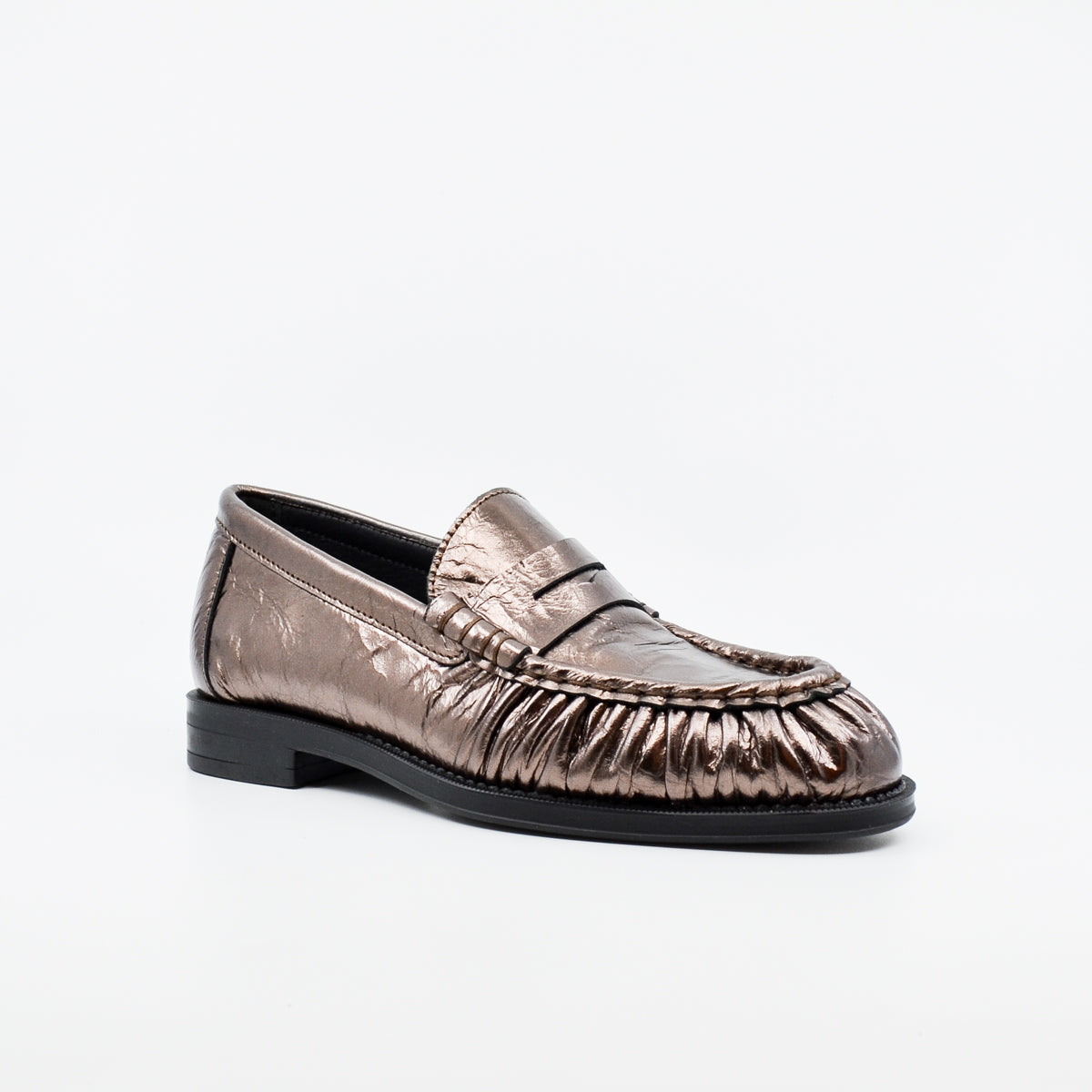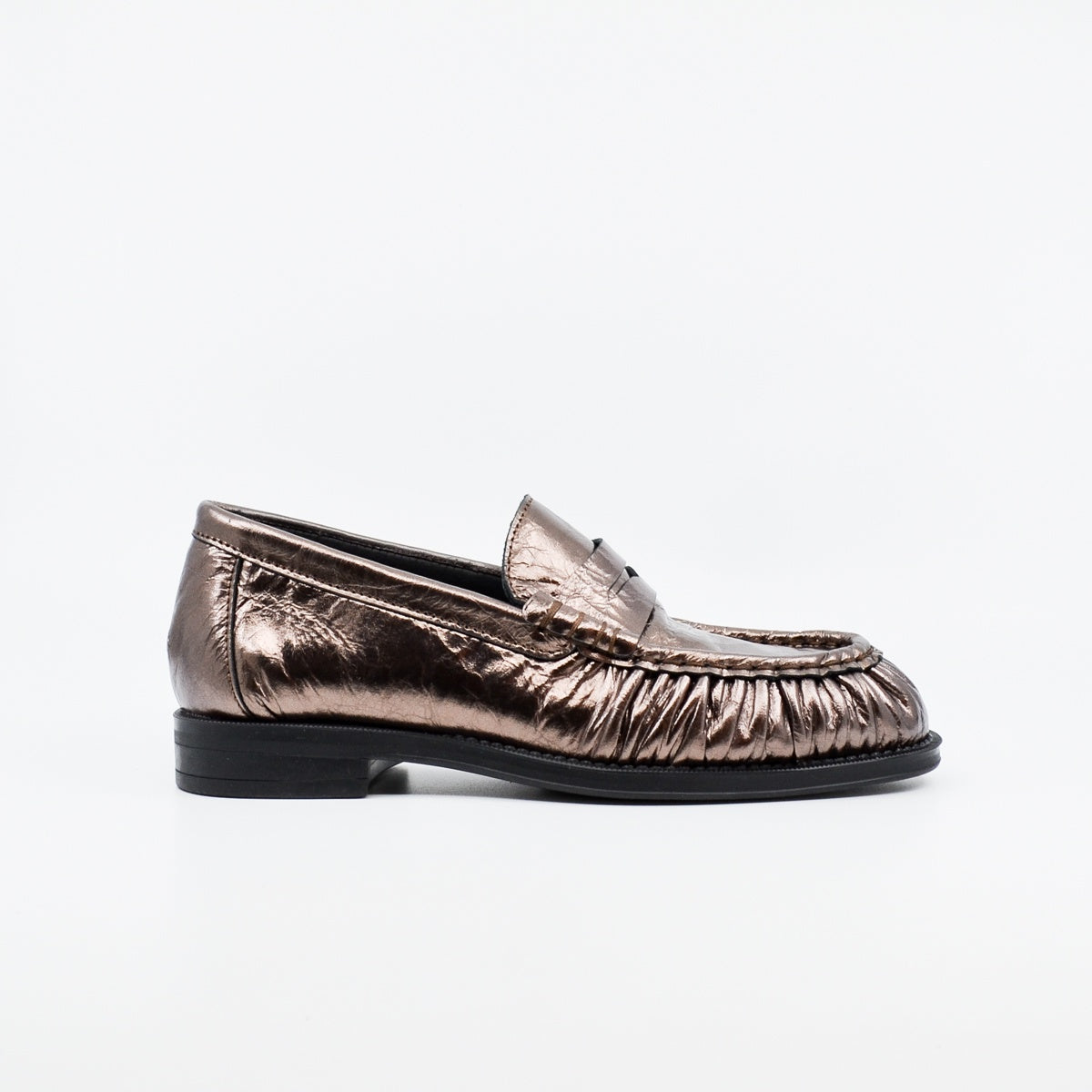 Introducing Alpe to The House of Shoes, a Spanish brand full of creativity and fashion. Perfectly on trend, this suede leather moccasin features a gathered stitch upper, almond shaped toe and cushioned footbed. Available in brown and in a metallic smooth leather. European sizing. Made in Spain. Leather upper, leather lining, synthetic sole. Flat heel.
