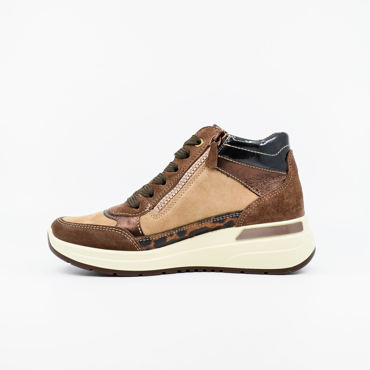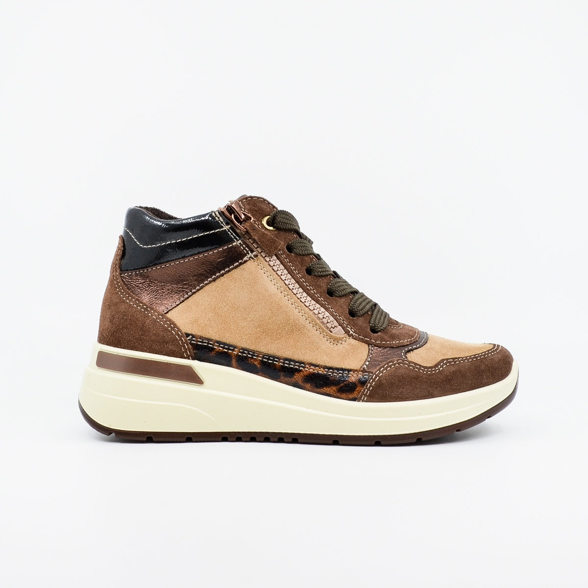 A versatile and comfortable high-cut leather sneaker for your winter wardrobe with warm bamboo lining. Available in Ara's extra wide "H" fit. Featuring a wide rounded toe, removable memory foam footbed using Ara's High Soft construction, bamboo lining, arch support, convenient outer zip and adjustable lace fastening. Available in Ara's extra wide "H" fit. May fit custom orthotics. UK sizing. Made in Portugal. Leather upper, bamboo fabric lining, rubber sole. Low wedge heel, 3cm.