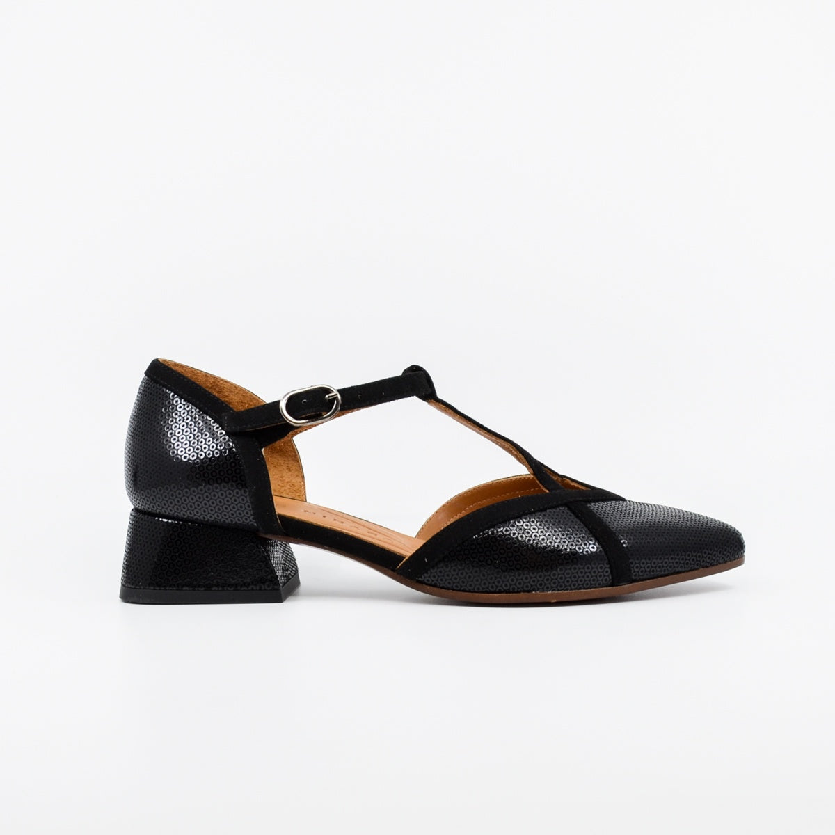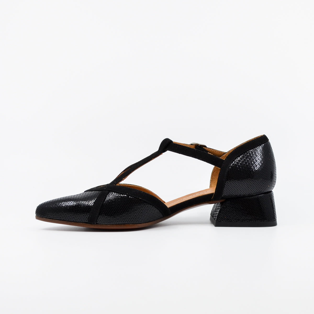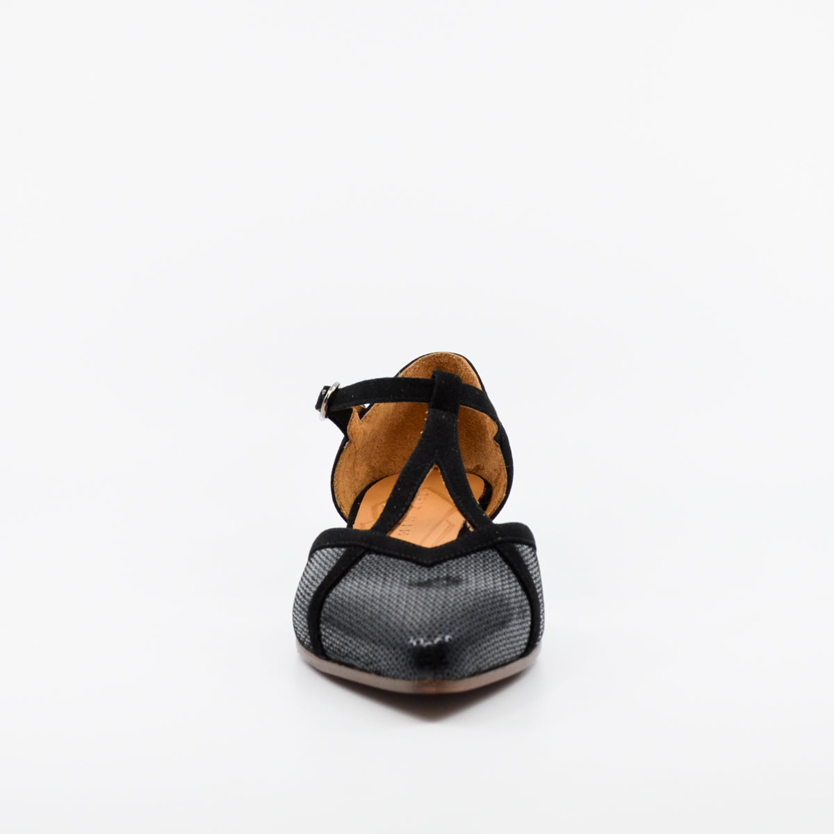 Hidrow is an elegant low-heeled T-bar style shoe with a softly pointed toe, adjustable strap around the ankle with buckle fastening, and a soft suede leather upper.