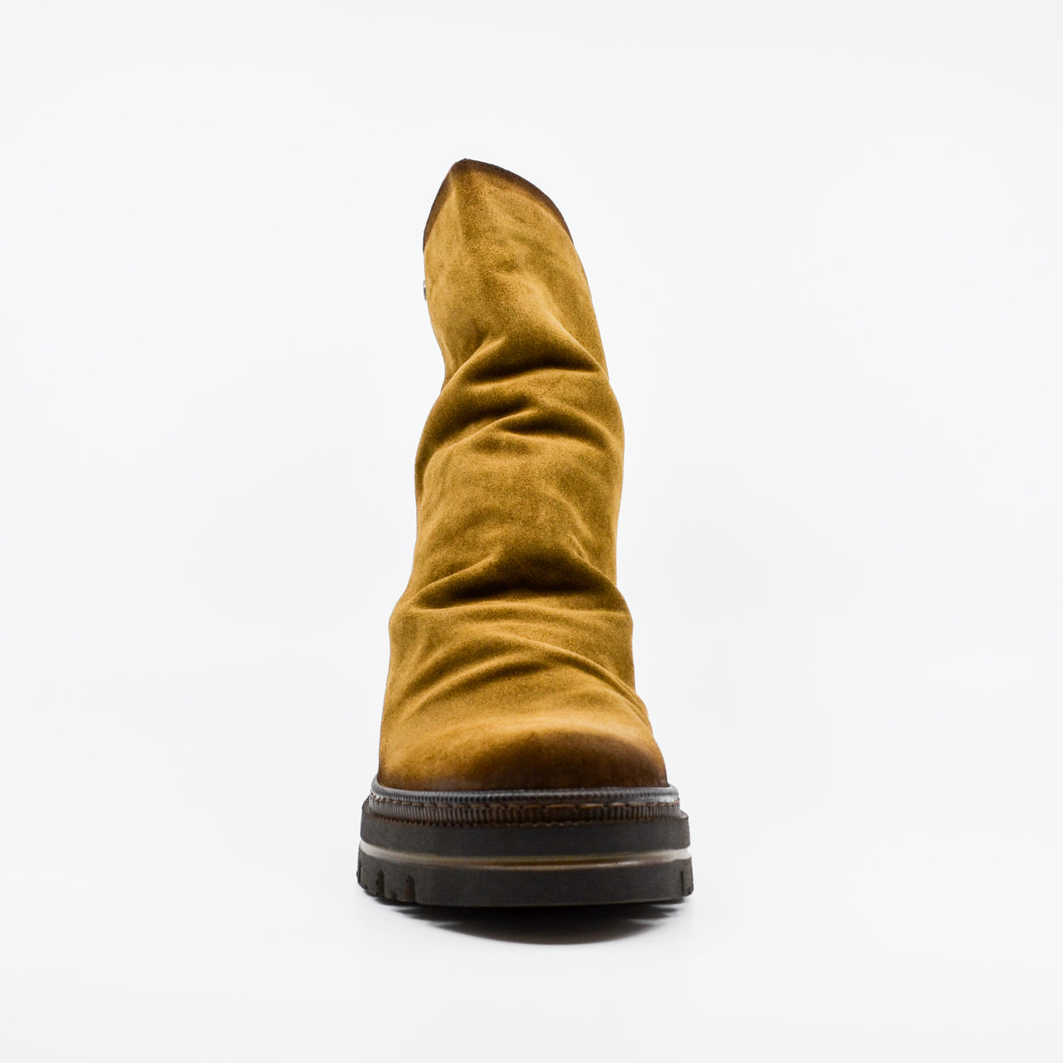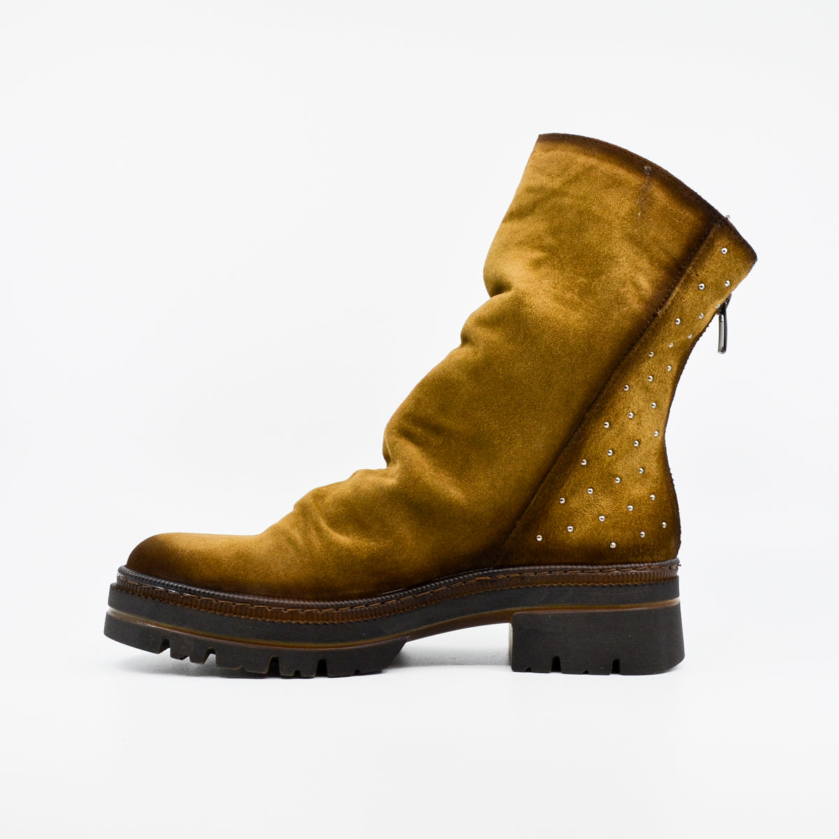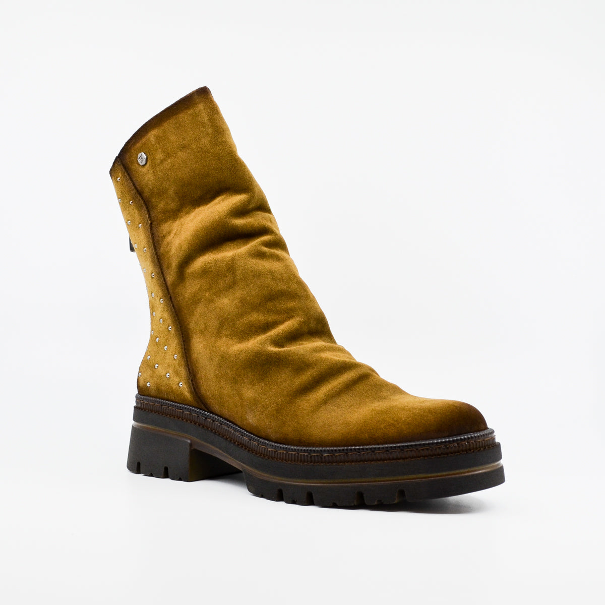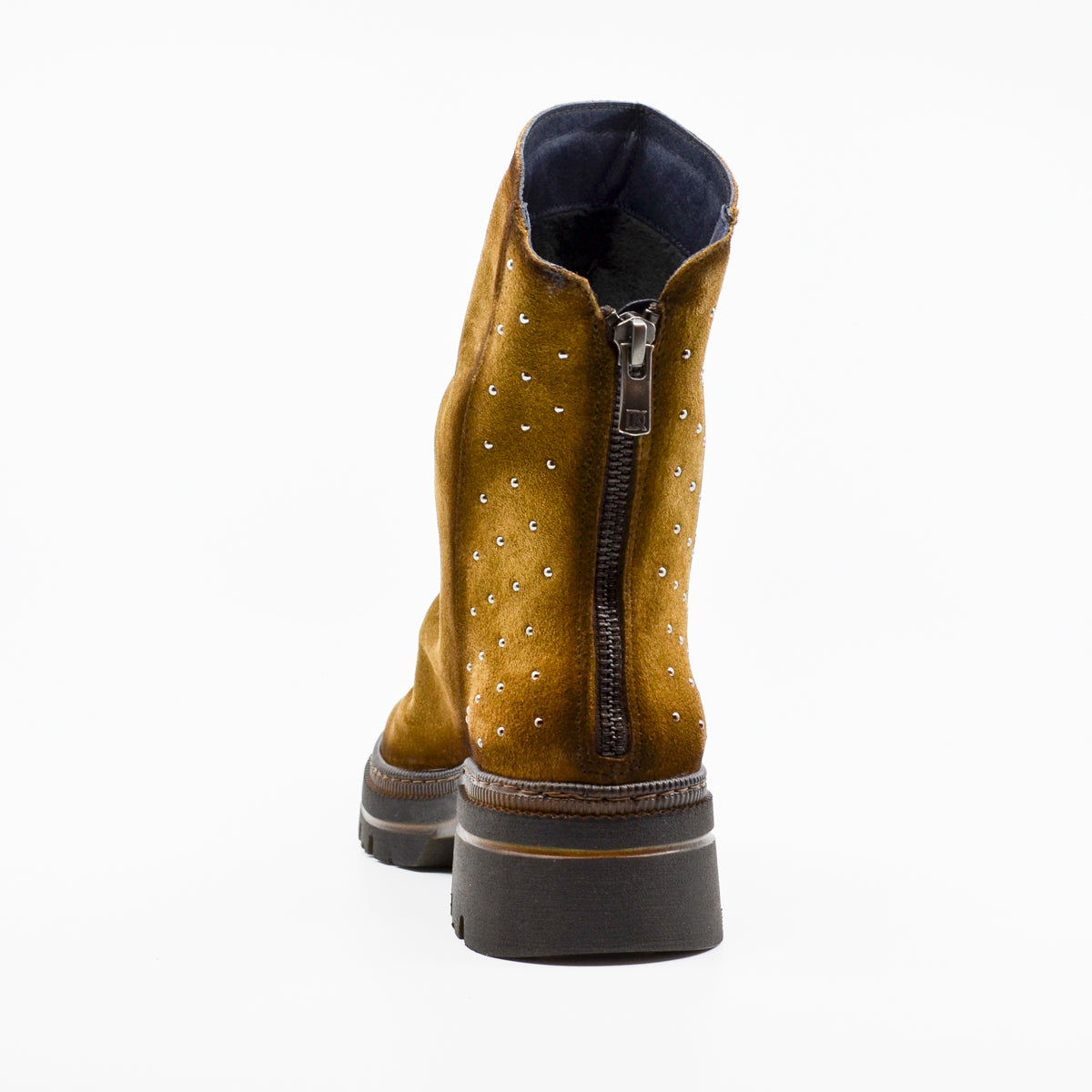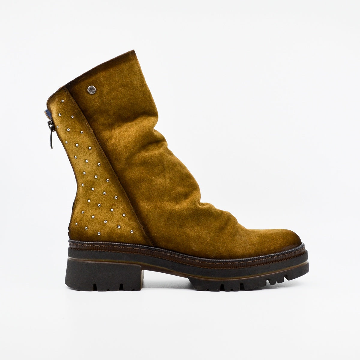 A soft and comfortable suede leather ankle boot featuring silver stud detailing at the heel. Available in moss and navy. The soft leather naturally gathers at the front of the ankle for a casual look. The platform rubber sole provides cushioning and support if you're standing for long periods, and the rear zip opening provides easy access, particularly if you have a high instep. European sizing. Made in Spain. Leather upper, leather lining, rubber sole. Flat heel.
