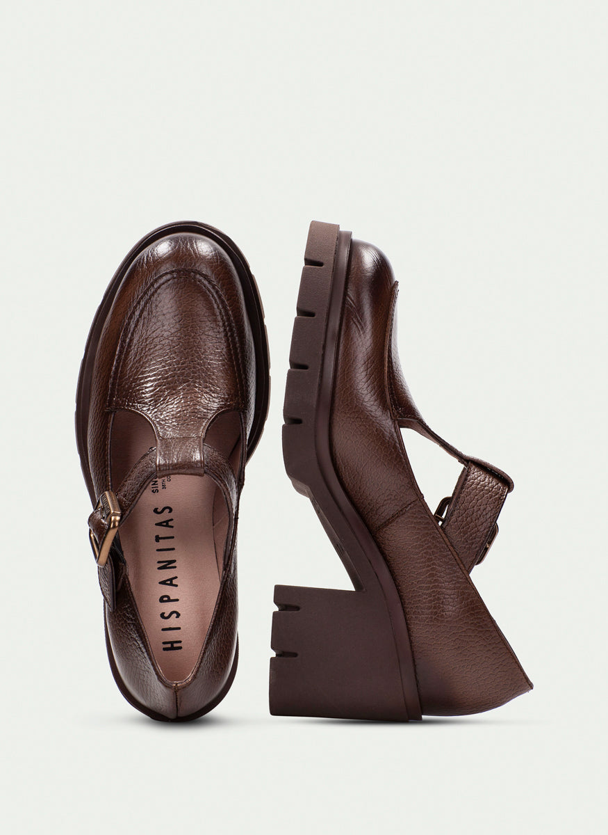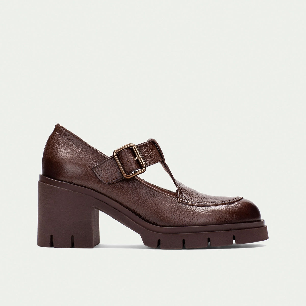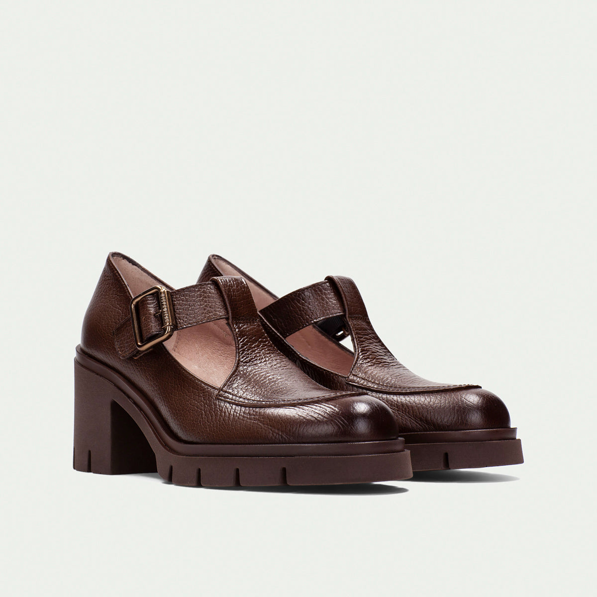 A chunky T-bar Mary Jane style for work or weekend. This striking style features a round toe, adjustable strap over the top of the foot with buckle fastening, high block heel, cushioned insole, leather upper and modern edge. Wear with pants or skirts, work or evening. The Tri-flow cushioned footbed provides incredible comfort and support for all day wear. The microfibre lining features "on steam" properties for breathability and a thermoregulating effect. European sizing. Made in Spain. Leather upper, microfibre lining, rubber sole. High heel, 7cm.