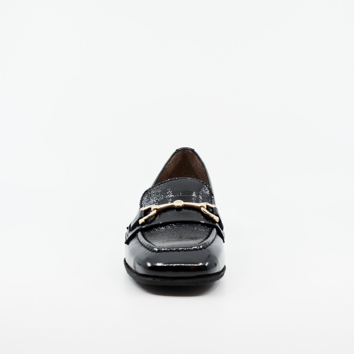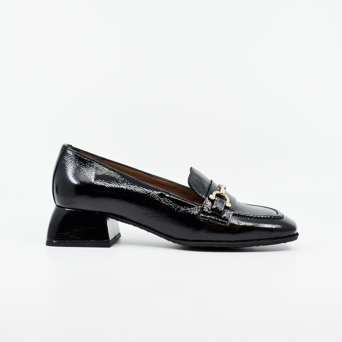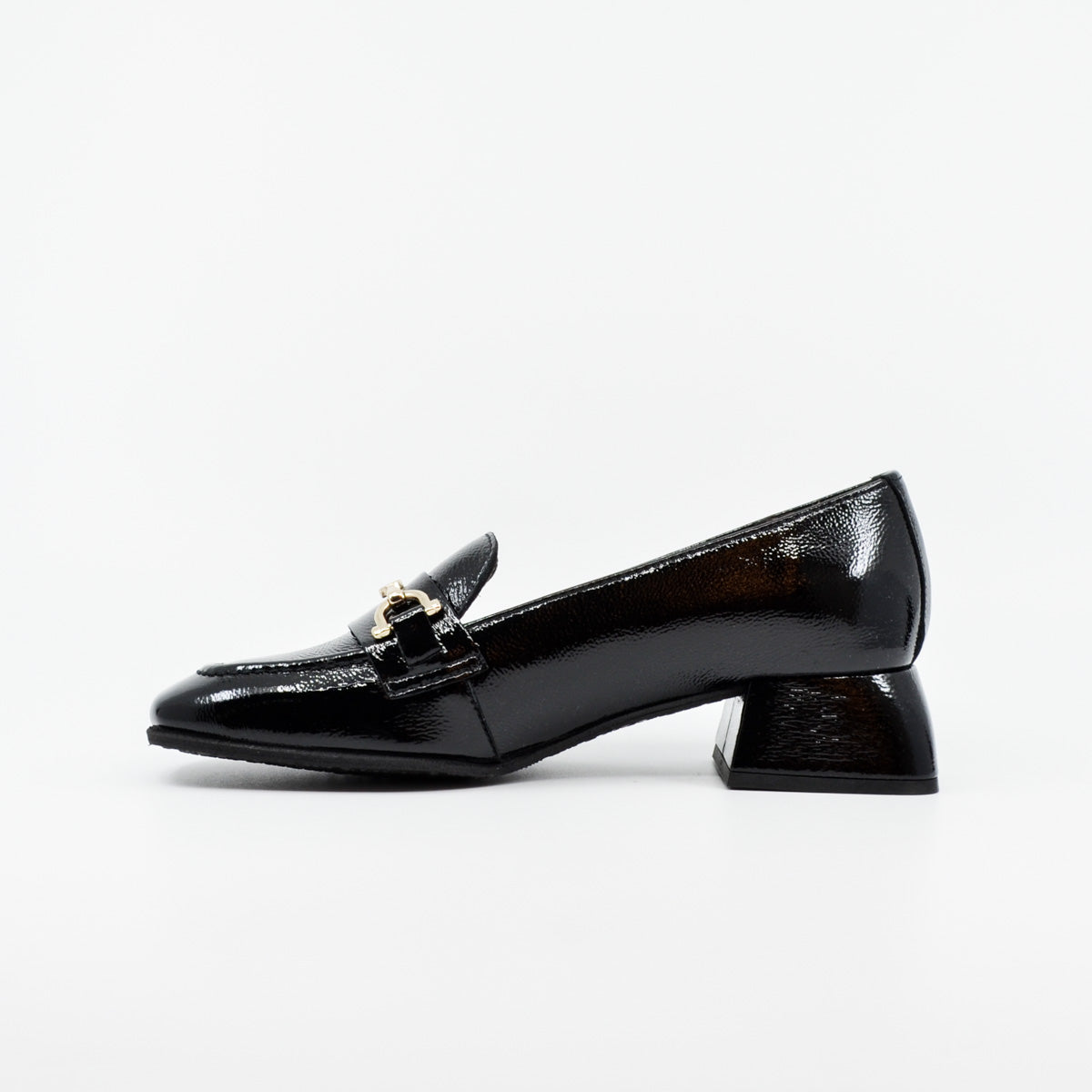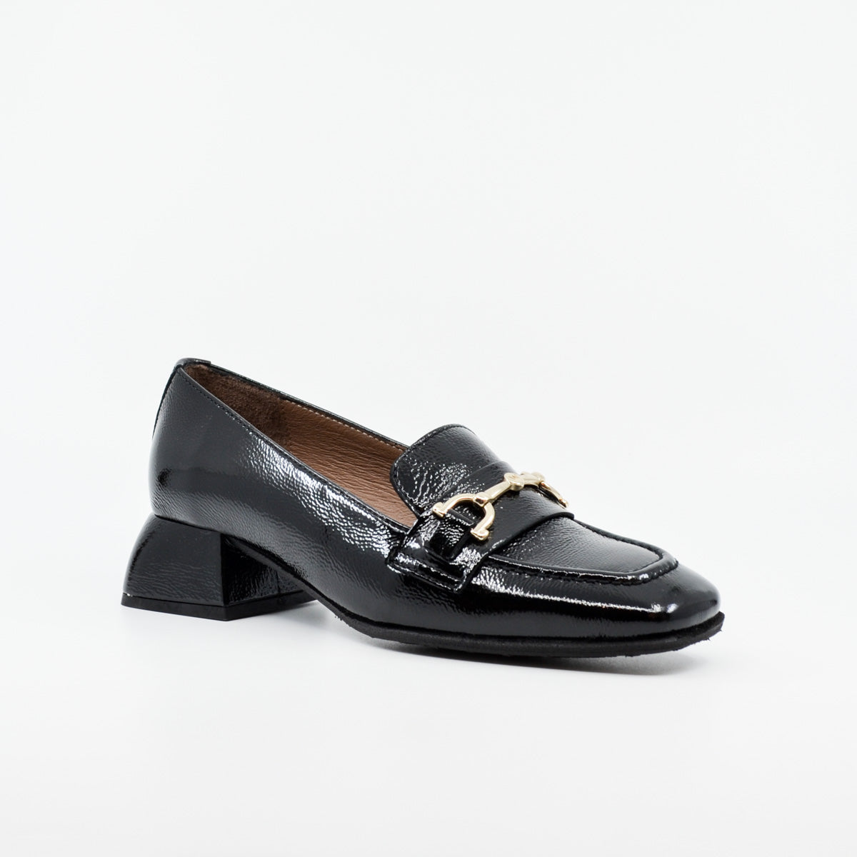 Classic slip on patent leather loafer with gold horsebit. Featuring a round toe, memory foam footbed, leather lining and comfort rubber sole. A great option for work, any season. European sizing. Made in Spain. Leather upper, leather lining, rubber sole. Low heel, 3.5cm.