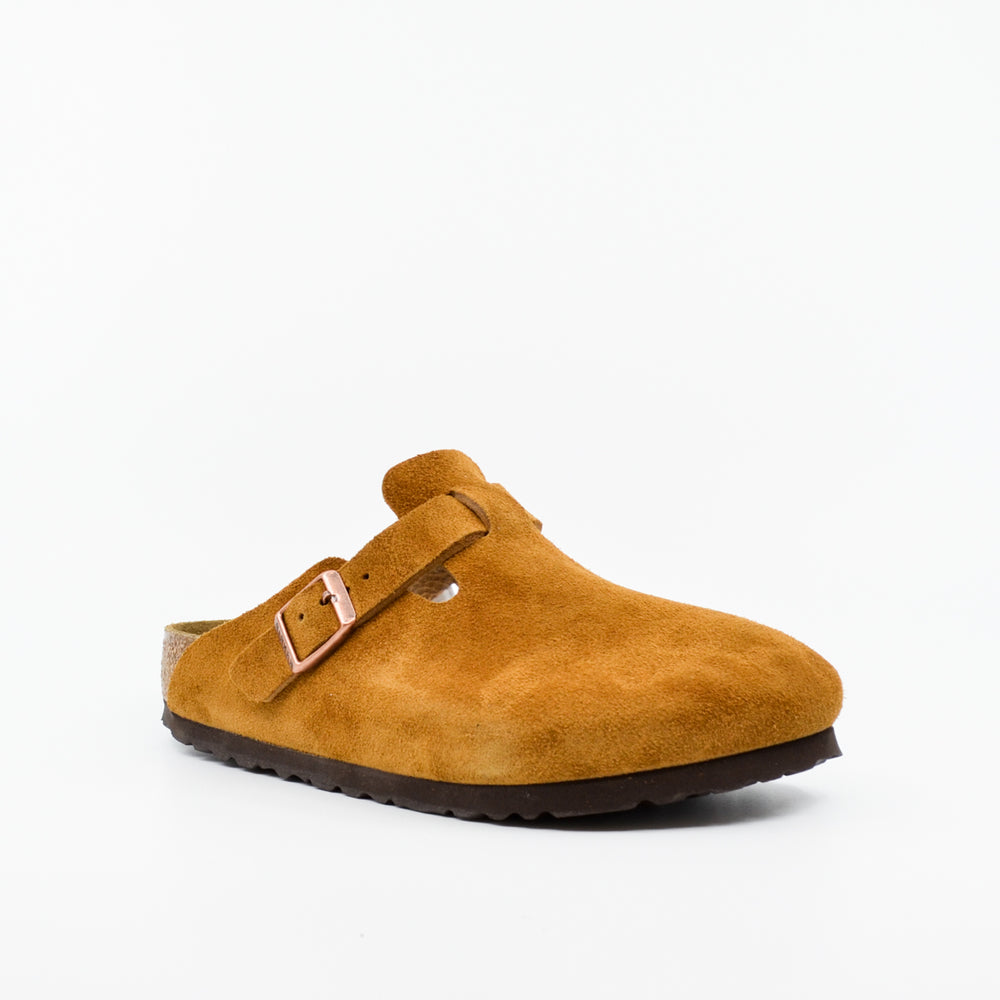 The Birkenstock Boston is a practical classic. Slip them on and you're off! Its sophisticated, individual design means it can be worn all year round, giving this style a legendary status for it's seasonal versatility. Equipped with a strap and buckle that can be adjusted across your instep the Boston clog provides a secure fit. The anatomically shaped footbed and roomy toe box makes them comfortable to wear creating a pleasant environment for the entire foot. European sizing. Leather upper, leather lining, EVA sole. Flat heel.