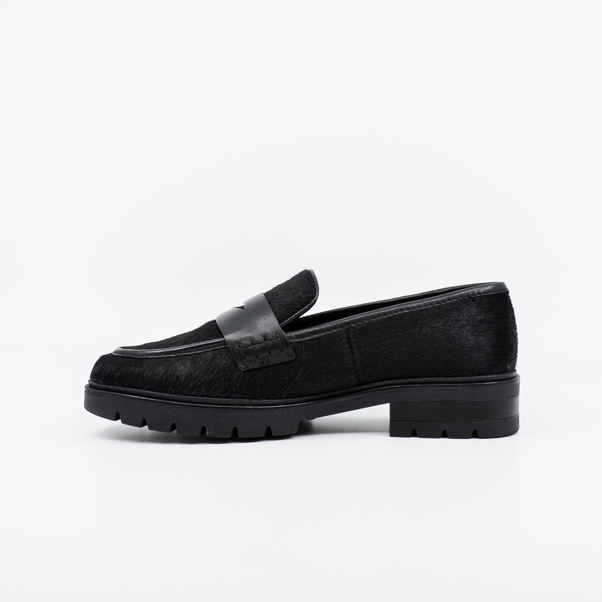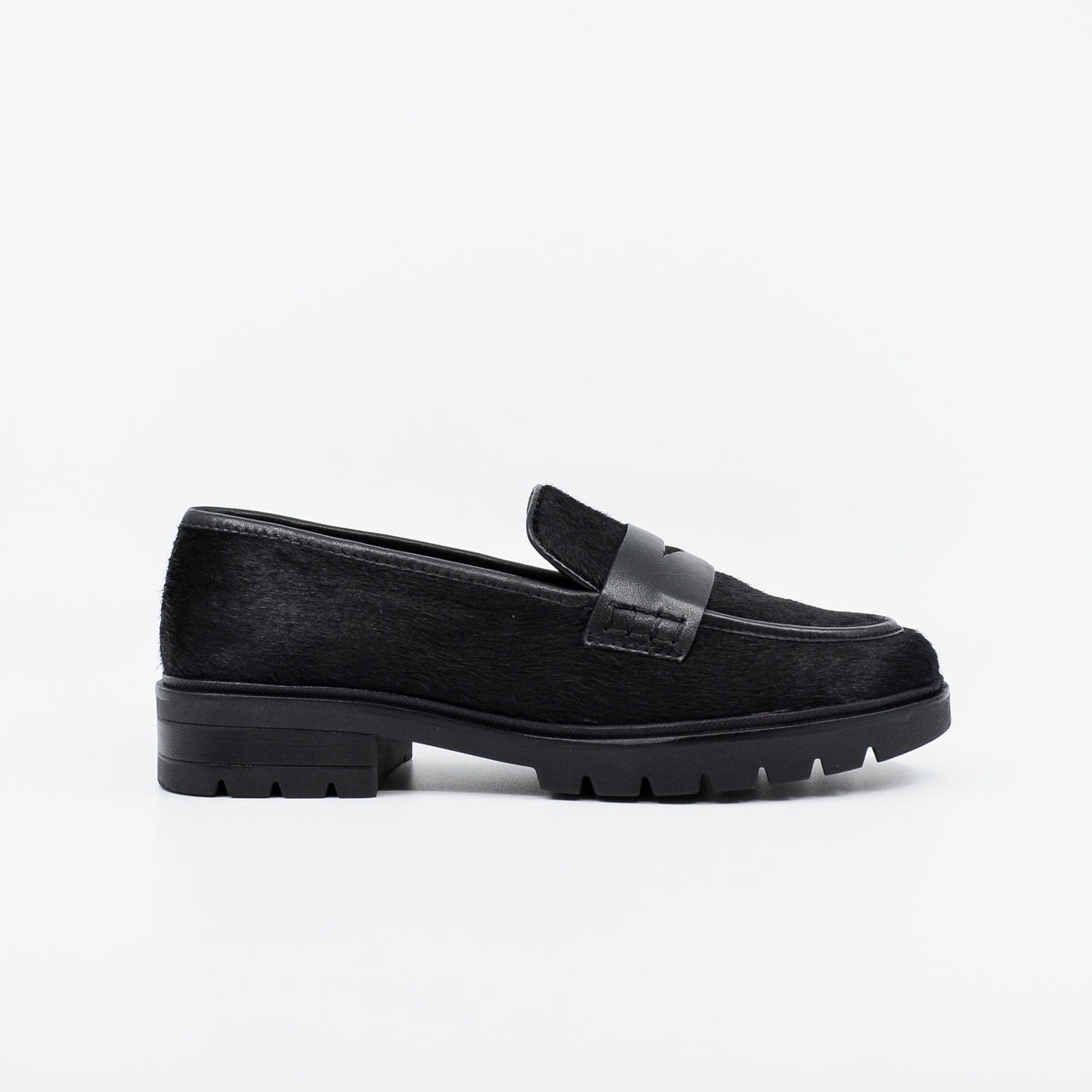 Comfortable leather loafer for winter. Featuring a black leather trim over the instep, leather upper with a textured "pony" finish. Leather lining and padded insoles for all day comfort. The insole is fixed, and includes arch support. Lightweight construction with a fashionable high tred sole. Perfect for work or weekend. UK sizing. Designed in Germany. Leather upper, leather lining, rubber sole. Flat heel.