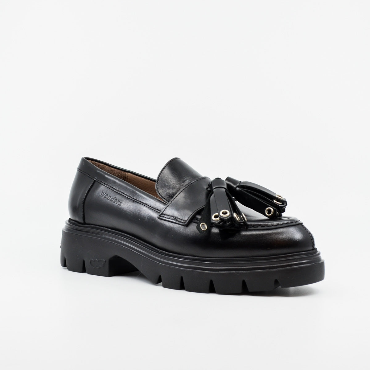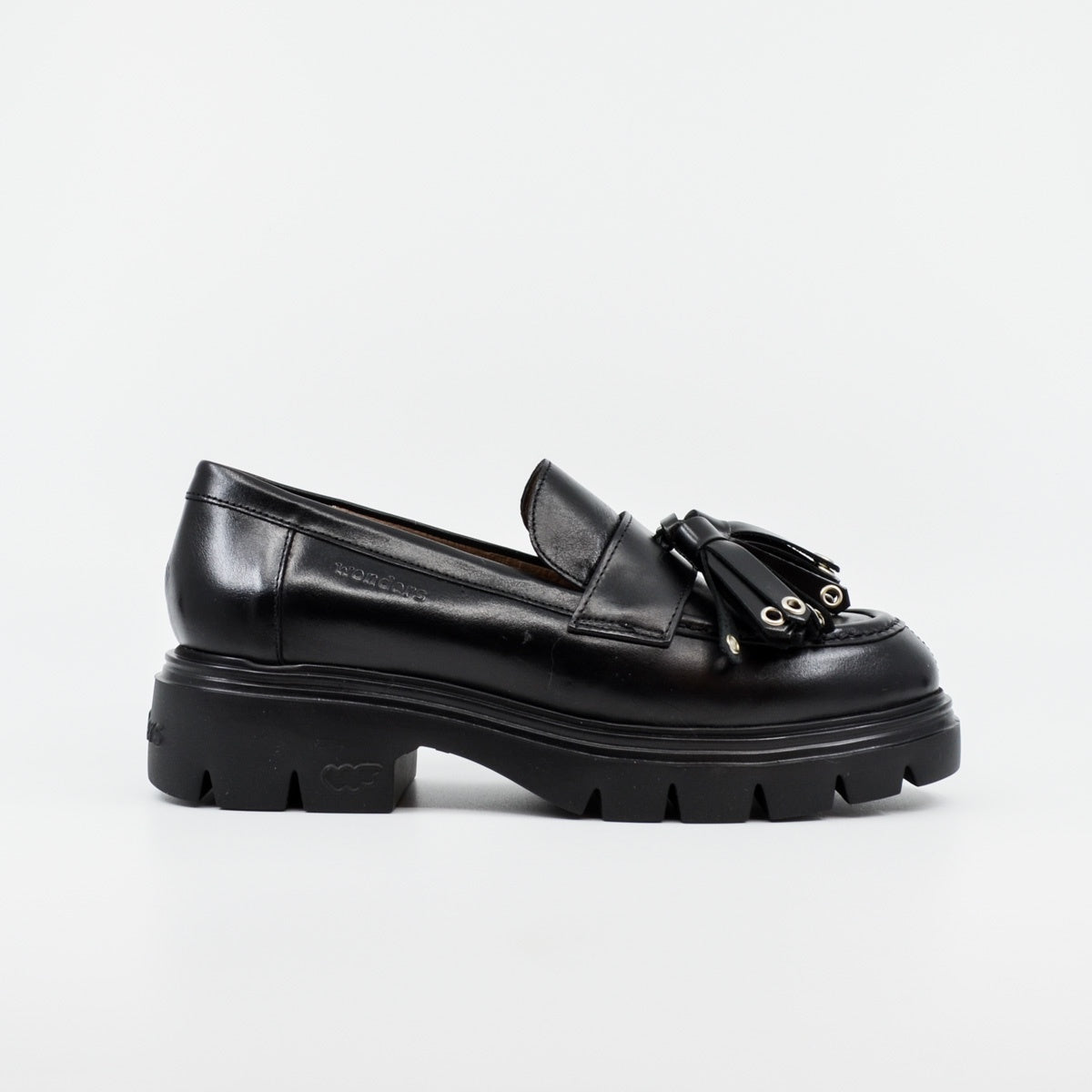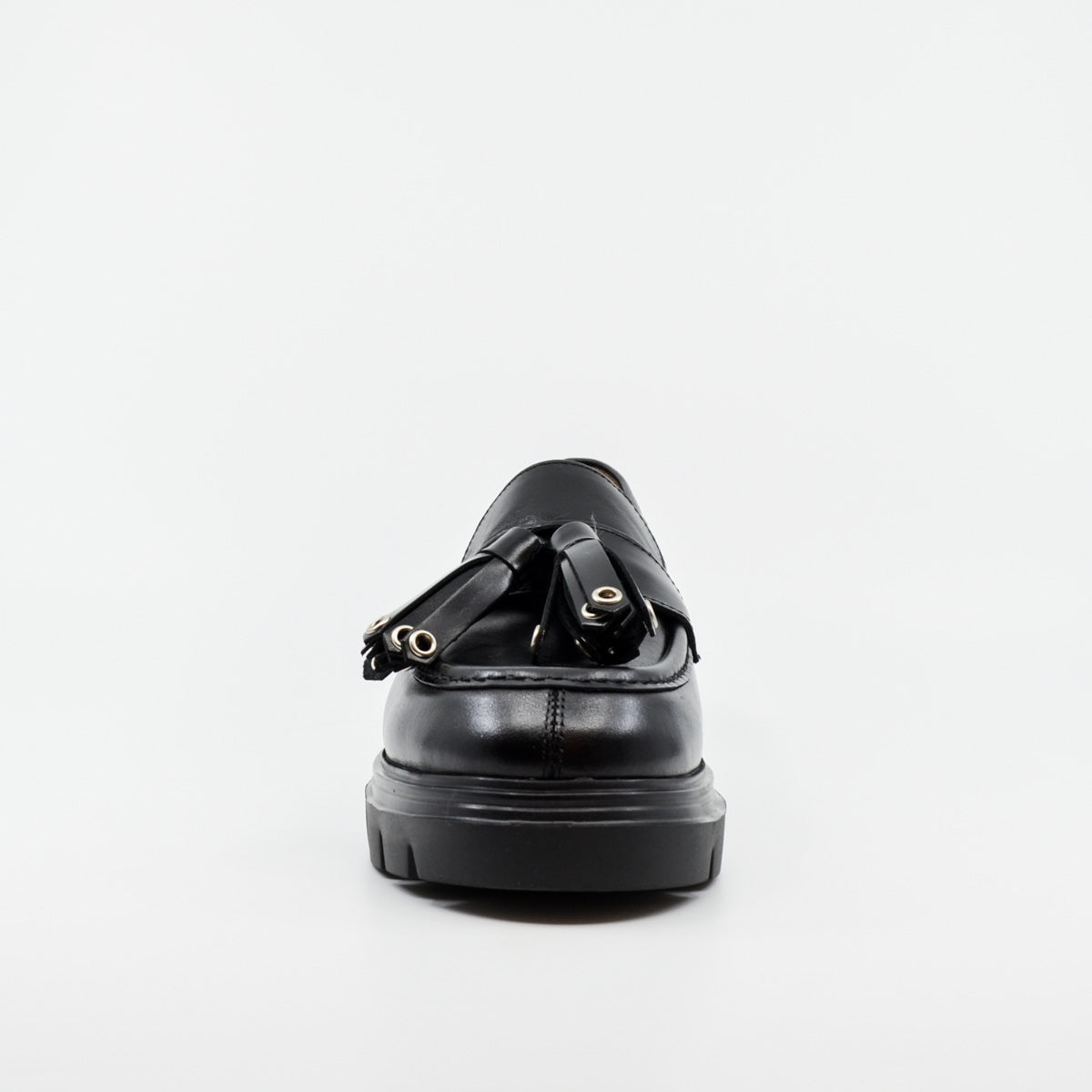 A bold and chunky slip on loafer made with a soft smooth leather upper. Featuring a round toe, leather tassle detailing, memory foam footbed, leather lining and comfort rubber sole. Wear with skirts, dresses or pants with ease. A great option for work. European sizing. Made in Spain. Leather upper, leather lining, rubber sole. Flat heel.