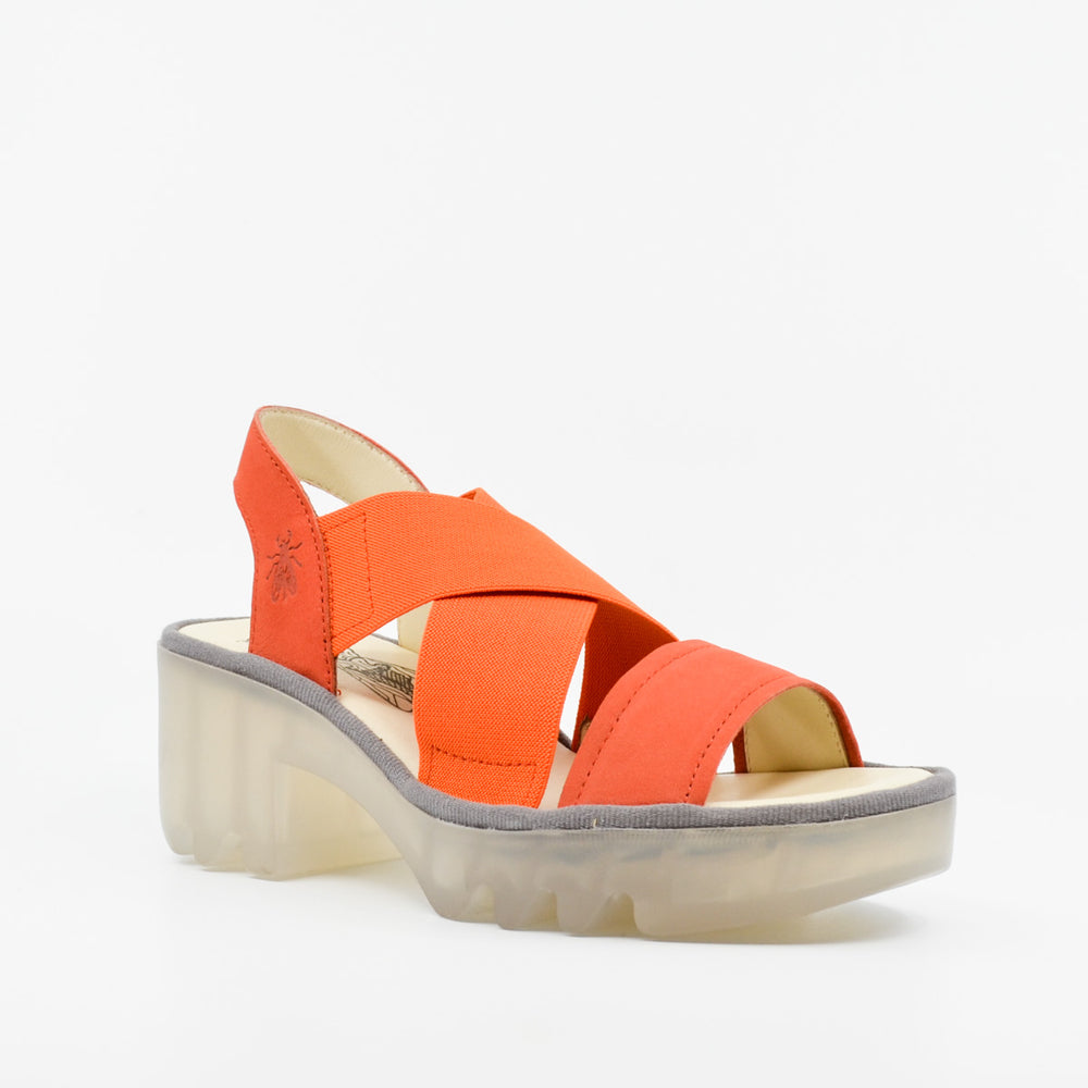 Embrace the iconic Fly London look with these comfortable mid heel platform sandals. Featuring a cushioned rubber sole, elastic and leather straps over the top of the foot and around the heel. Slip these on and off easily with the elastic cross straps over the instep. Comfort and cushioning is built into every pair of Fly London shoes. Made in Portugal. European sizing. Leather upper, leather and material lining, rubber sole. Mid block heel 6cm, includes 2.5cm platform.