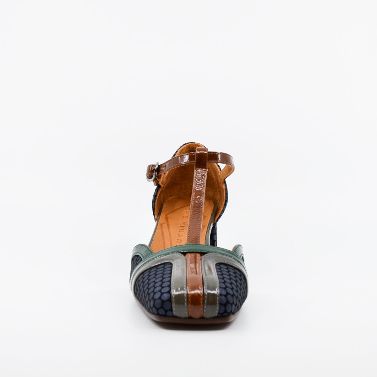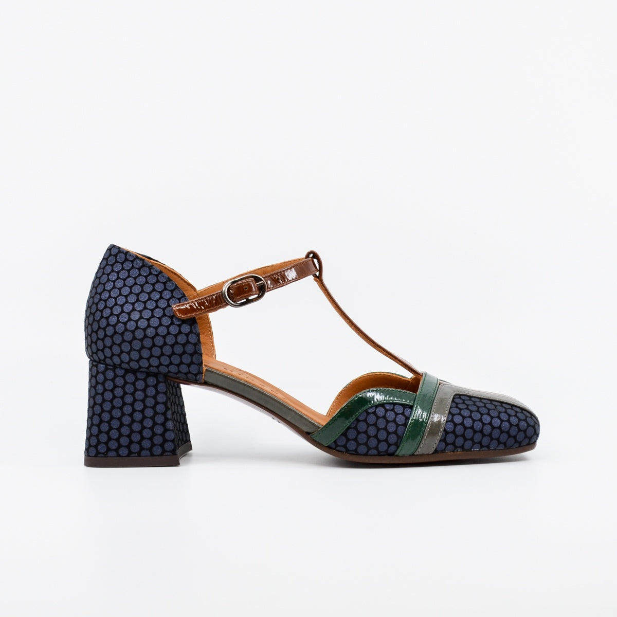 Vola is an elegant T-bar style heel with a decorative mixed leather front, an adjustable ankle strap with buckle fastening, a softly squared toe, and a mid-block heel.