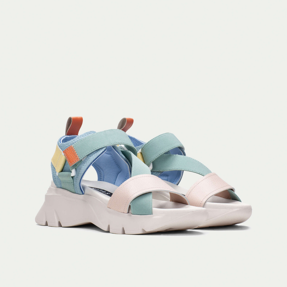 Cushioned and lightweight sport sandal with volume sole and leather upper. A combination of leather and elastic upper design for full coverage over the top of the foot and adjustable heel strap, velcro fastening. This comfortable sandal features the Hispanitas Triflow technology, a triple layer of cushioning that provides flexibility and comfort. Made in Spain. European sizing. Leather (cow) upper, microfiber lining, expanded EVA rubber sole. Platform wedge sole with 5.5cm raise.