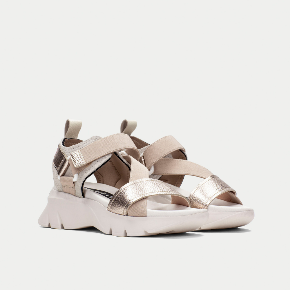 Cushioned and lightweight sport sandal with volume sole and leather upper. A combination of leather and elastic upper that provides full coverage over the top of the foot and adjustable heel strap, velcro fastening. This comfortable sandal features the Hispanitas Triflow technology, a triple layer of cushioning that provides flexibility and comfort. Made in Spain. European sizing. Leather (cow) upper, microfiber lining, expanded EVA rubber sole. Platform wedge sole with 5.5cm raise.