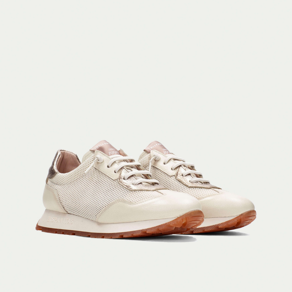 Hispanitas sneakers are a popular choice each season, and the Kansas is an updated version of the Loira sneakers in new colourways. This cushioned and lightweight sneaker is made of a combination of materials and leather. Slip these on and off easily with their elastic lace fastening. The mesh upper is soft and moulds to the foot easily, also providing airflow on warmer days. This versatile sneaker features the Hispanitas Triflow technology, a triple layer of cushioning that provides flexibility and comfort. It also features a removable insole and "on steam" microfibre lining for breathability and thermoregulating properties. Made in Spain. European sizing. Recycled polyester and leather (cow) upper, microfiber lining, thermoplastic rubber sole. Flat heel.