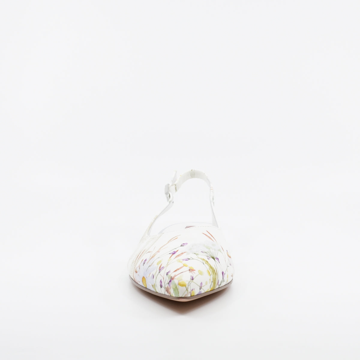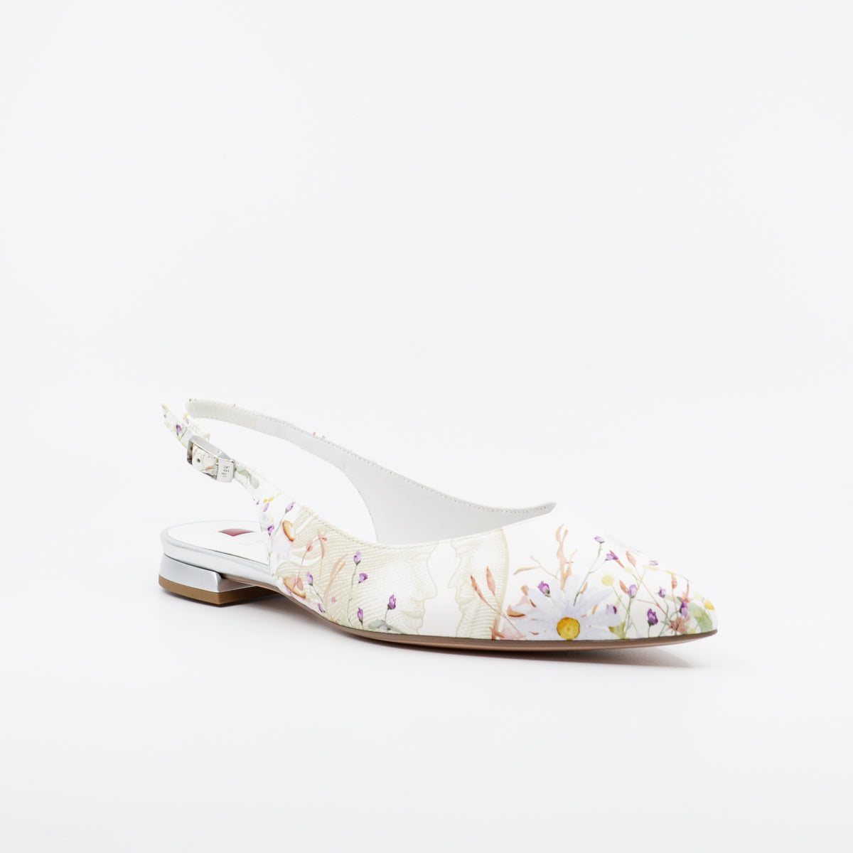 An elegant pointed toe slingback in a light floral print. Featuring a soft leather upper that moulds easily to the shape of the foot, pointed toe, padded footbed and adjustable heel strap, buckle fastening. Transition easily from work to night with this soft leather shoe. Wear with dresses, skirts or shorts. UK sizing. Made in Hungary. Leather upper, leather lining, synthetic sole. Flat heel.