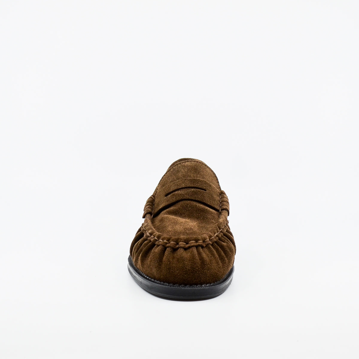 Introducing Alpe to The House of Shoes, a Spanish brand full of creativity and fashion. Perfectly on trend, this suede leather moccasin features a gathered stitch upper, almond shaped toe and cushioned footbed. Available in brown and in a metallic smooth leather. European sizing. Made in Spain. Leather upper, leather lining, synthetic sole. Flat heel.