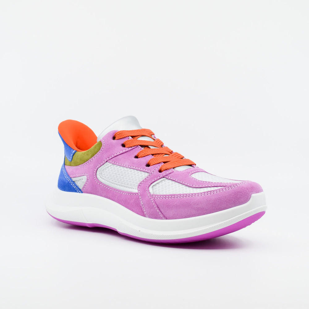 Sports inspired pink multi coloured leather sneaker with mesh panels. Available in Ara's extra wide "H" fit. Featuring extra platform in the sole (1.2cm) and removable memory foam footbeds with Ara's High Soft construction. May fit a custom orthotic. Wide rounded toe and built in arch support. European sizing. Made in Portugal. Leather and material upper, bamboo lining, rubber sole. Flat heel.