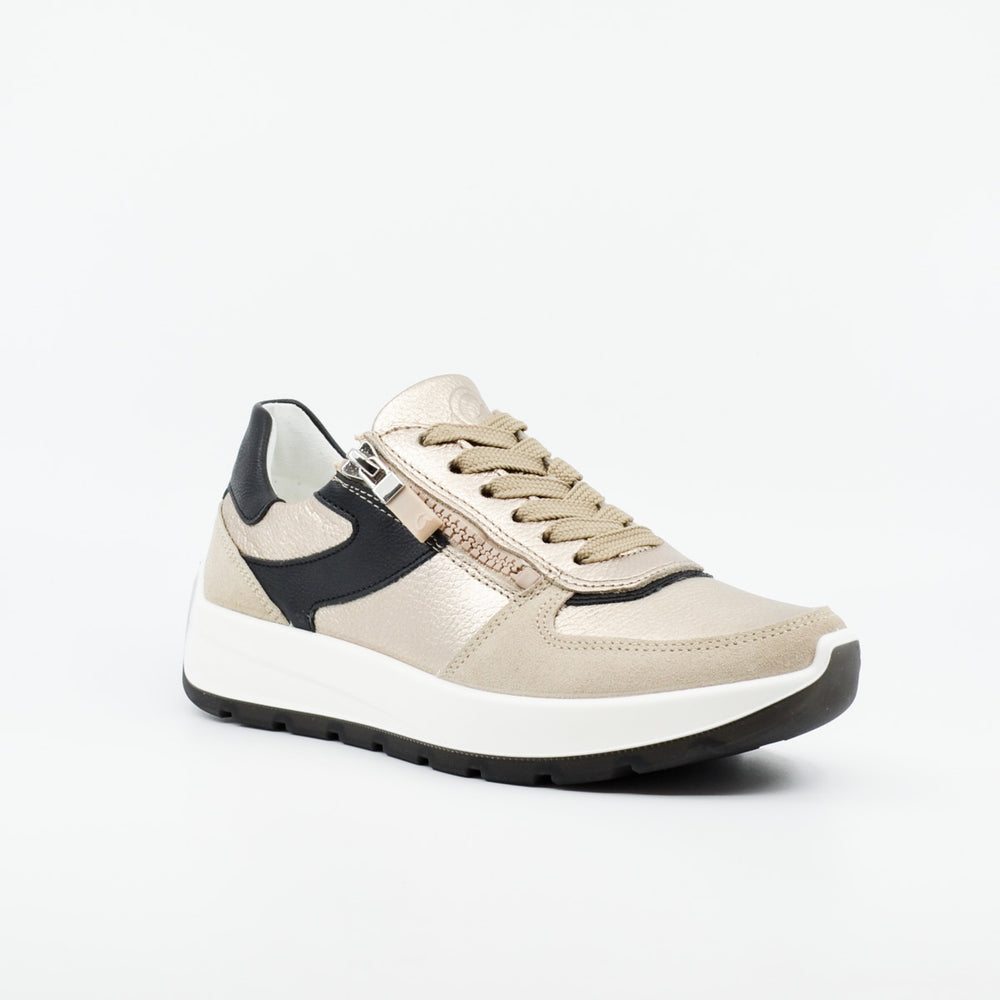 An incredibly soft and comfortable leather sneaker in a bold metallic and black colour combination. The adjustable cotton lace fastening and convenient side zip opening allow them to be fully adjusted to your foot. Featuring Ara's signature bamboo blend lining and High Soft insole construction, these sneakers will be comfortable and supportive for all day wear. Arch support included within. May fit custom orthotics. Extra wide 'H' fit. UK sizing. Made in Portugal. Leather upper, bamboo lining, rubber sole. Flat heel.