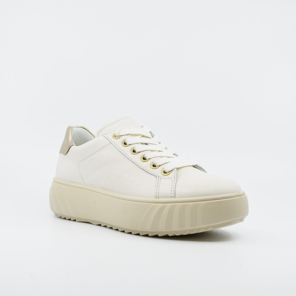 An elevated fashionable cream leather sneaker with a chunky sole and elevated gold heel. Available in Ara's extra wide "H" fit. Featuring a wide rounded toe, removable memory foam footbed using Ara's High Soft construction, arch support, adjustable lace fastening and extra padded sole. May fit custom orthotic. UK sizing. Made in Portugal. Leather upper, bamboo lining, rubber sole. Flat heel.