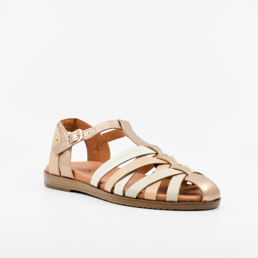 This all leather sandal features crossed leather straps over the top of the foot, enclosed toe, adjustable ankle strap with buckle fastening and contoured footbed with arch support. It moulds to the foot well and provides softness and support for all day wear. European sizing. Made in Spain. Leather upper, leather lining, rubber sole. Flat heel.