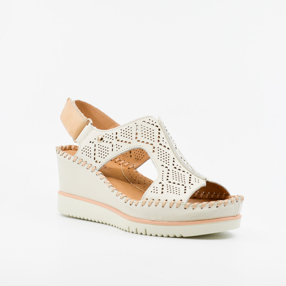 A classic and trusted style by Pikolinos. This all leather sandal features a laser cut leather strap over the top of the foot, peep toe design, adjustable ankle strap with velcro fastening and platform wedge sole. The handstitched construction is a regular feature of this popular brand's summer sandals. It hugs the foot well providing lots of coverage and provides softness and support under the arch for all day wear. European sizing. Made in Spain. Leather upper, leather lining, rubber sole. High wedge heel, 7cm.