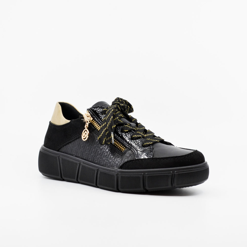 A fashionable black leather sneaker with gold accents. Featuring a convenient side zip opening, adjustable cotton lace fastening, removable insole, rounded toe and comfort sole. Wear with skirts, dresses or pants with ease. European sizing. Leather upper, leather & material lining, rubber sole. Flat heel.