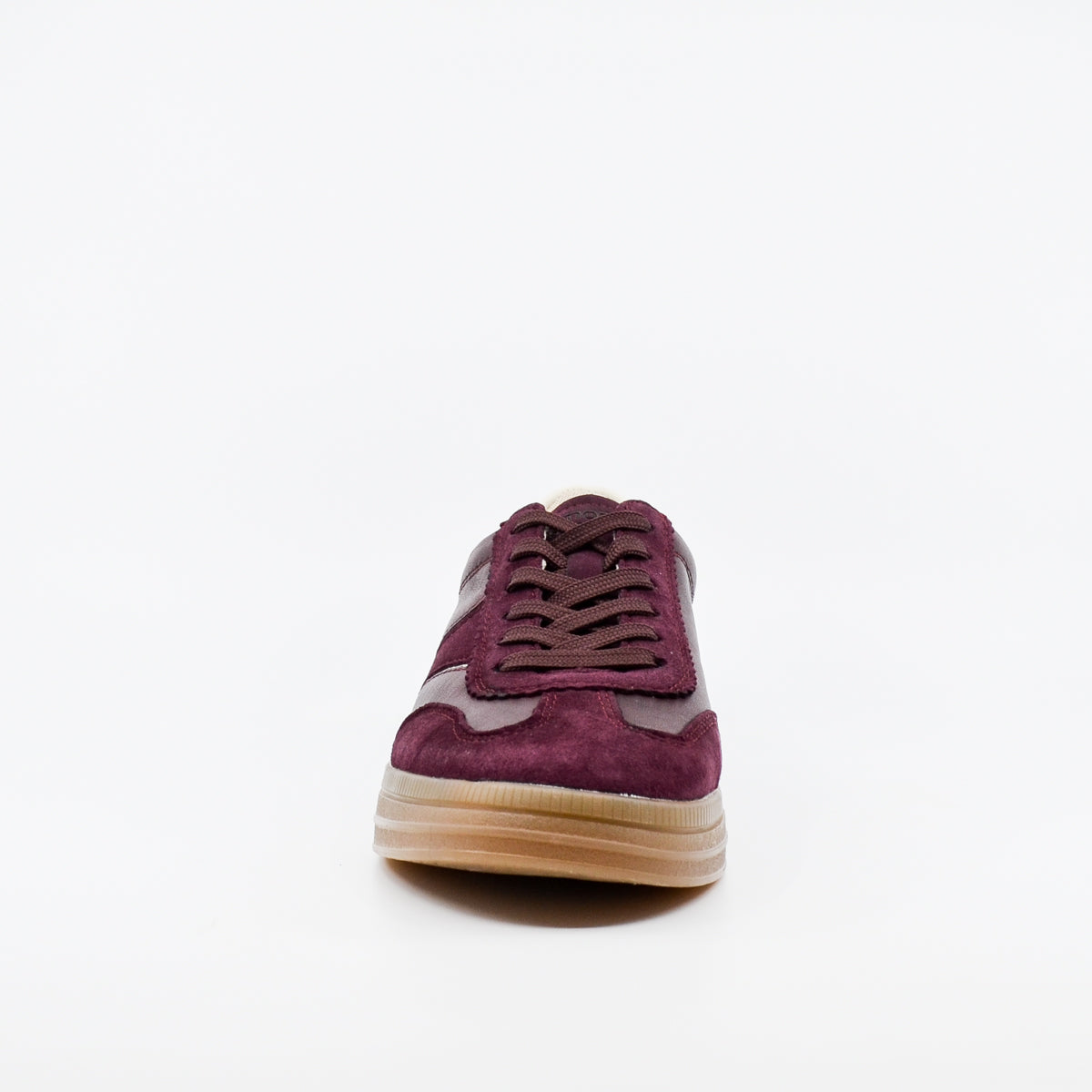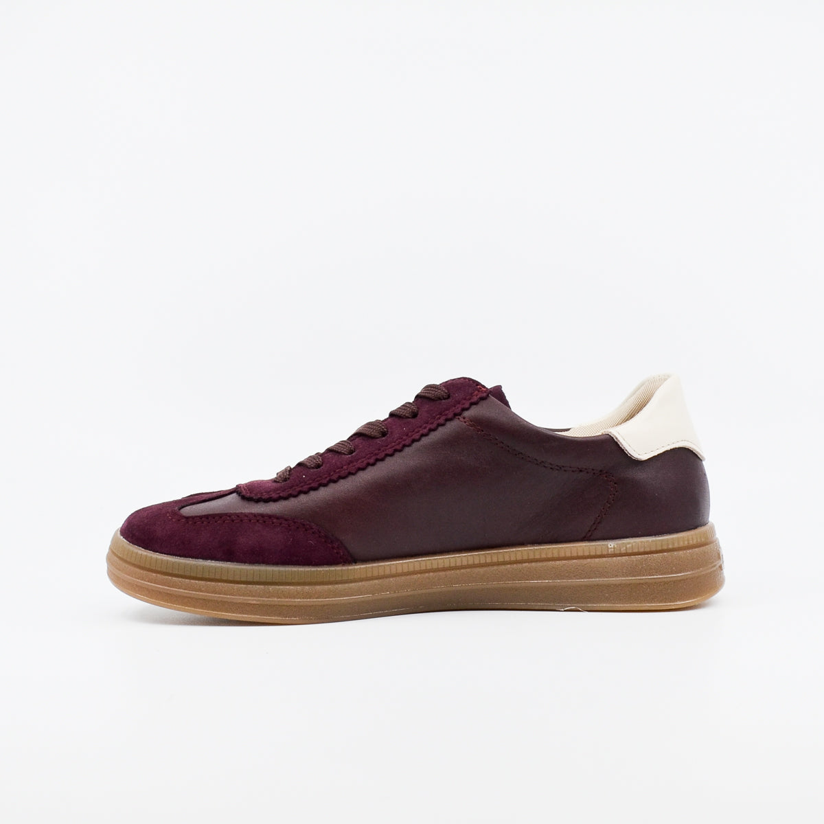 A fashionable leather sneaker. Featuring an adjustable cotton lace fastening, removable insole, rounded toe and comfort platform rubber sole. Wear with skirts, dresses or pants with ease. May fit a custom orthotic. Available in burgundy with an off-white trim. European sizing. Leather upper, material lining, rubber sole. Flat heel.