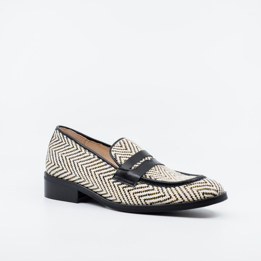 Classic slip on summer loafer with a textured white and black leather upper. Featuring a round toe, memory foam footbed, leather lining and comfort rubber sole. Wear with skirts, dresses or pants with ease. A great option for work. European sizing. Made in Spain. Leather upper, leather lining, rubber sole. Low heel, 3cm.