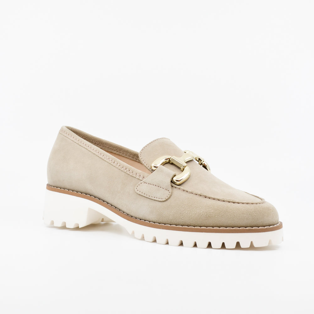 Comfortable suede leather loafer for summer. Available in green, sand and blue. Featuring a silver chain trim over the instep, soft suede leather upper with leather lining and padded insoles for all day comfort. The insole is fixed, and includes arch support. Lightweight construction with a fashionable high tred sole. Perfect for work or weekend. UK sizing. Designed in Germany. Made in Portugal. Leather upper, leather lining, rubber sole. Flat heel.