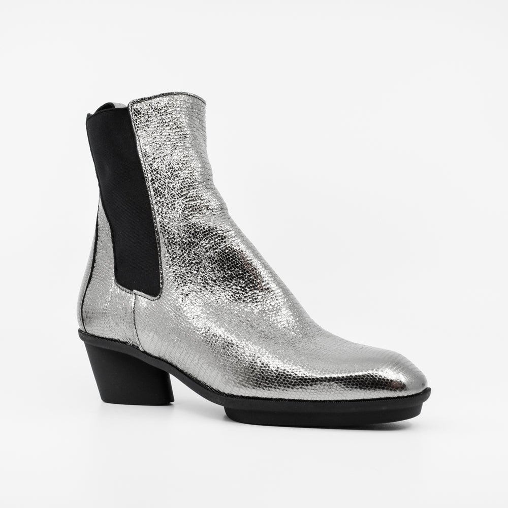 Stand out in these beautiful 'sequin' embossed leather ankle boots by French brand, Arche. Known for their impeccable quality, fit and comfort, this boot looks fabulous as well as providing comfort and support for all day wear. Don't limit these beauties to night time wear only! Featuring a soft cuban inspired mid block heel, elastic gussets, almond shaped toe and soft footbed. European sizing. Made in France. Leather upper, leather lining, rubber sole. Mid heel, 4cm.
