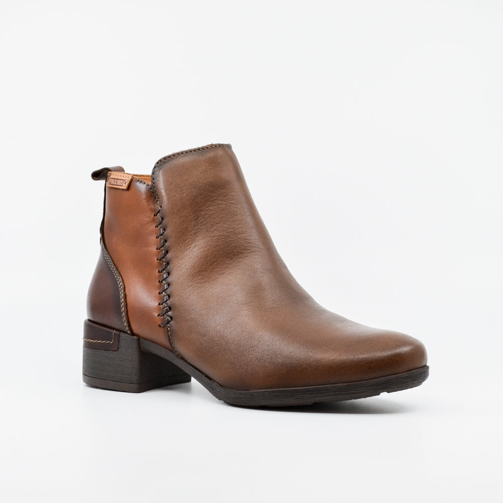 Classic leather ankle boot by best selling brand, Pikolinos. Available in black and topo. This boot is perfect for every day wear and features a mid-low stacked block heel, inner zip fastening, leather stitching on the outside, cushioned leather lined insole with support under the arch and a warm lining. Original design from Pikolinos, Spain. Leather upper, warm textile lining and rubber sole. Mid heel, 4cm.