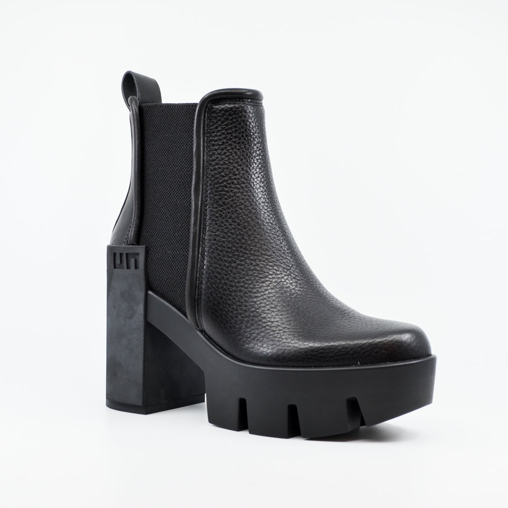 Exclusive to The House of Shoes in Australia. The Grip Chelsea Mid ankle boot is a winter staple by Dutch brand United Nude. Featuring a platform rubber sole and block heel, elastic panels either side of the ankle and rounded toe. Pull on and off easily. European sizing. Leather upper, leather lining, rubber sole. High heel, 9cm (includes 4cm platform).