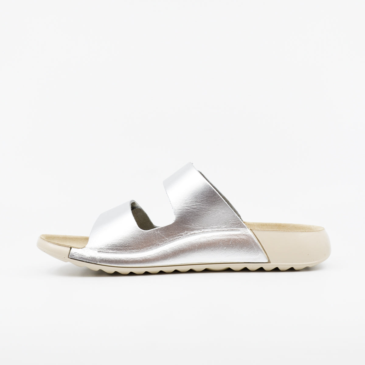 The ECCO Cozmo Silver Sandal is a minimalist slide crafted from leather. Available in silver and white gold. The two adjustable straps with a velcro fastening provide a secure fit. Built with ECCO’s FLUIDFORM™ Direct Comfort Technology, it seamlessly bonds the upper to a soft PU sole for lightweight flexibility and durability. An anatomically shaped, suede-covered footbed provides natural arch support, while the treaded outsole ensures reliable grip—ideal for stylish, all-day summer wear. European sizing. Leather upper, textile lining, rubber sole. Flat heel.