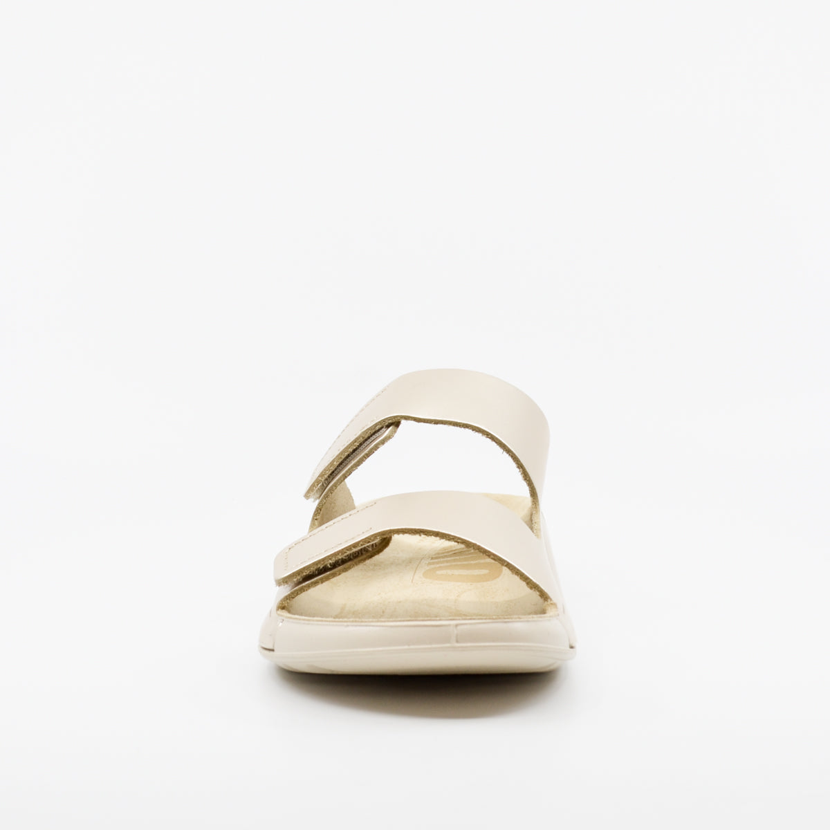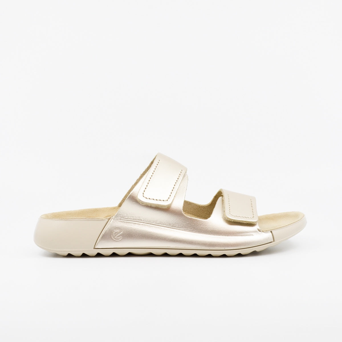 The ECCO Cozmo Silver Sandal is a minimalist slide crafted from leather. Available in silver and white gold. The two adjustable straps with a velcro fastening provide a secure fit. Built with ECCO’s FLUIDFORM™ Direct Comfort Technology, it seamlessly bonds the upper to a soft PU sole for lightweight flexibility and durability. An anatomically shaped, suede-covered footbed provides natural arch support, while the treaded outsole ensures reliable grip—ideal for stylish, all-day summer wear. European sizing. Leather upper, textile lining, rubber sole. Flat heel.
