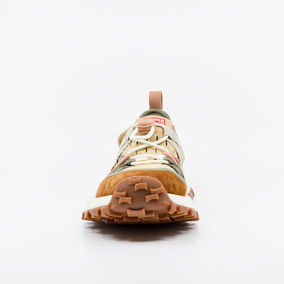 The Camper Twins sneaker blends trail functionality with asymmetrical design, featuring a mixed-material upper of suede, nubuck, and breathable mesh. It includes adjustable hook-and-loop straps, elastic toggle lacing, and a recycled PET lining for comfort and support. A cushioned OrthoLite® insole and lightweight EVA midsole enhance shock absorption, while the rugged rubber outsole with multidirectional lugs ensures reliable traction. Finished in a layered earthy palette, it delivers both outdoor performance and Camper’s signature mismatched Twins style. European sizing. Leather & material upper, material lining, rubber sole. Flat heel.