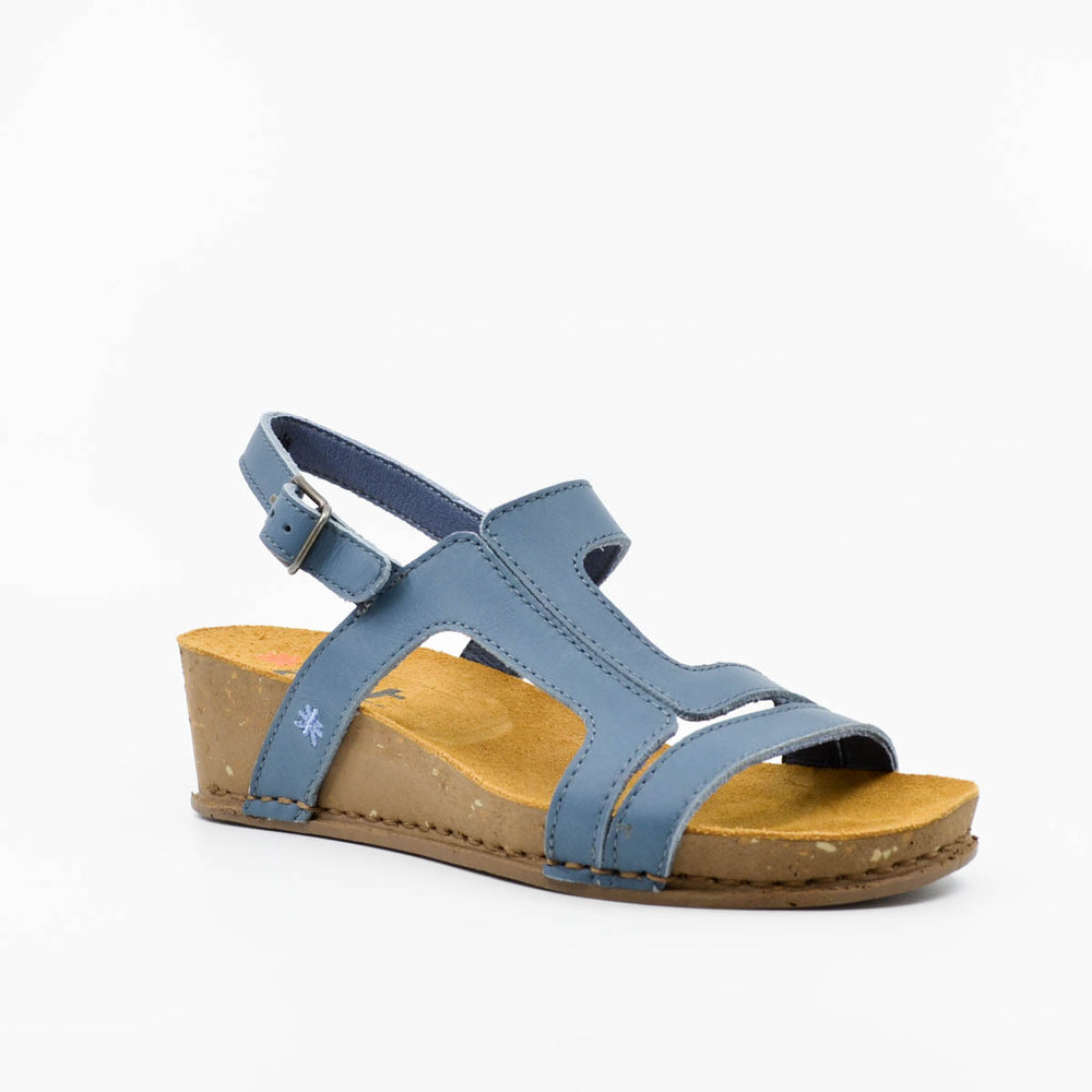Lightweight and flexible wedge sandal by comfortable and colourful brand, Art. Featuring an off-set T-bar strap over the top of the foot, adjustable ankle strap with buckle fastening, suede leather lined footbed with extra cushioning and built-in arch support, and shock absorbing sole. Made in Portugal. European sizing. Leather upper, leather lining, rubber sole. Mid wedge heel, 4cm.