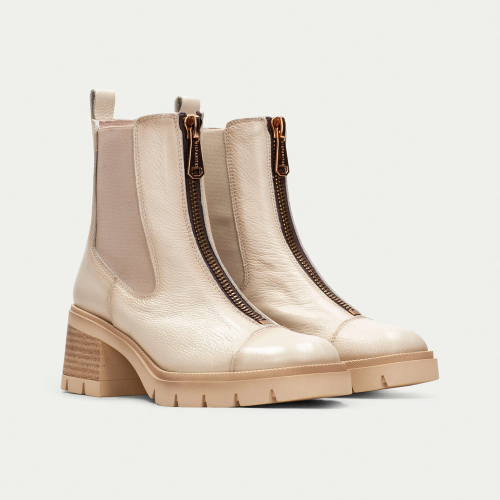 The Everest boot is a chunky style offering a flattering round toe, mid block heel and cushioned vegan leather insole. Using "on steam" microfibre lining for breathability and thermoregulating properties. Featuring a front zip opening, leather upper and elastic panels on either side of the ankle in a classic Chelsea style. Available in black and milk (cream). Original design by Hispanitas. Made in Spain. European sizing. Leather upper, vegan leather lining, rubber sole. Mid heel, 5cm.