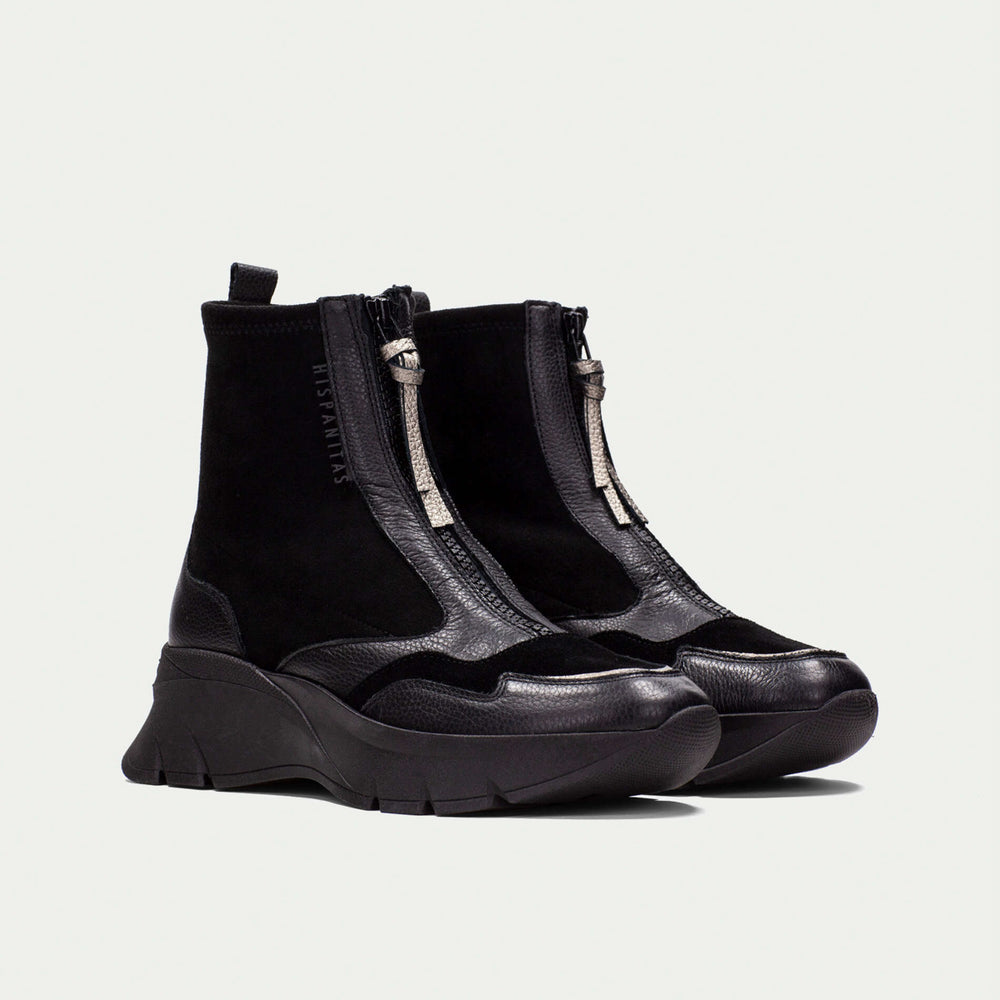 A sports-inspired ankle boot featuring a chunky lightweight wedge sole, providing support and comfort for all day wear. The perfect casual ankle boot this season. Featuring a front zip opening, removable insole, rounded toe and cushioned footbed. Contains the Hispanitas "on steam" microfibre lining for breathability and a thermoregulating effect. European sizing. Made in Spain. Leather upper, vegan leather lining, expanded EVA rubber sole. Platform wedge sole with 5 cm raise.